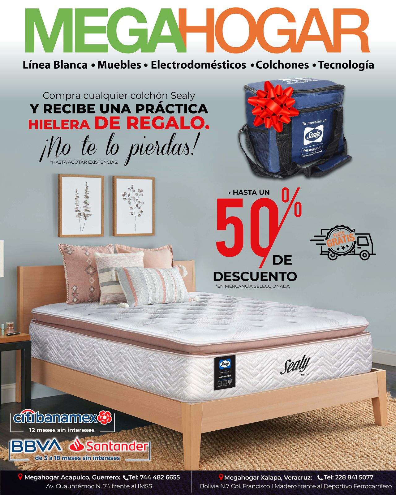 ¡Es momento de renovar tu descanso al mejor precio! Aprovecha hasta el 50% de descuento en una gran selección de colchones. Y eso no es todo: al comprar un colchón Sealy, ¡te llevas una hielera completamente GRATIS!